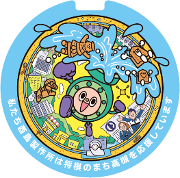 酉島製作所は大正8年(1919年)に創業したポンプの専業メーカーです。私たちが製造するポンプは、市民の皆さまの安心・安全で快適な暮らしを支える心臓として、上水道や下水道、商業施設や各種工場など街のいたる所で活躍しています。このマンホール蓋は、酉島製作所のマスコット「トリポン」が街の隅々に水を届け、人々が笑顔になっていることをイメージしてデザインしました。