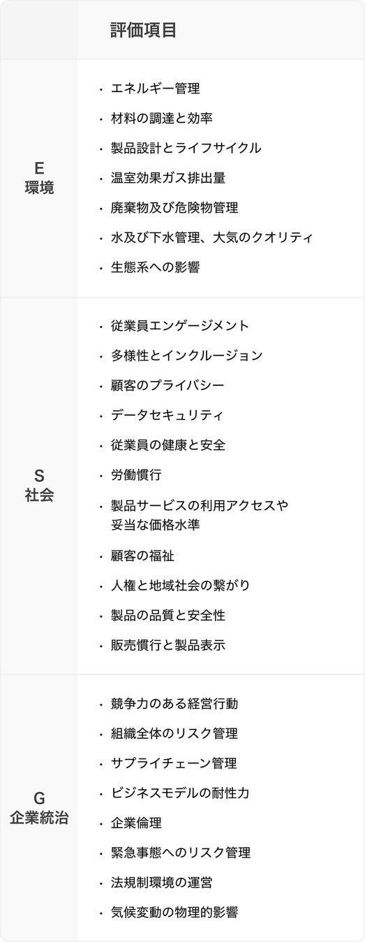 企業のESGへの取り組みを評価する第三者評価機関によって、企業の社会的・環境的に配慮した取り組みを評価することで算出される指標を指します。大きく「環境(Environment)」「社会(Social)」「企業統治(Governance)」の3つより算出され、トータル的にスコア化(※5)しています。