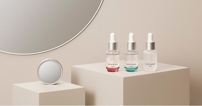 2021年春よりスタートした『cocktail graphy』は、自宅で肌測定ができるIoTデバイス『skin mirror』と、肌の状態に合わせて毎月変化する3本のパーソナライズスキンケア、自分の肌のためだけの情報が届く『cocktail graphy』専用アプリから構成される定期販売モデルのサービスです。
