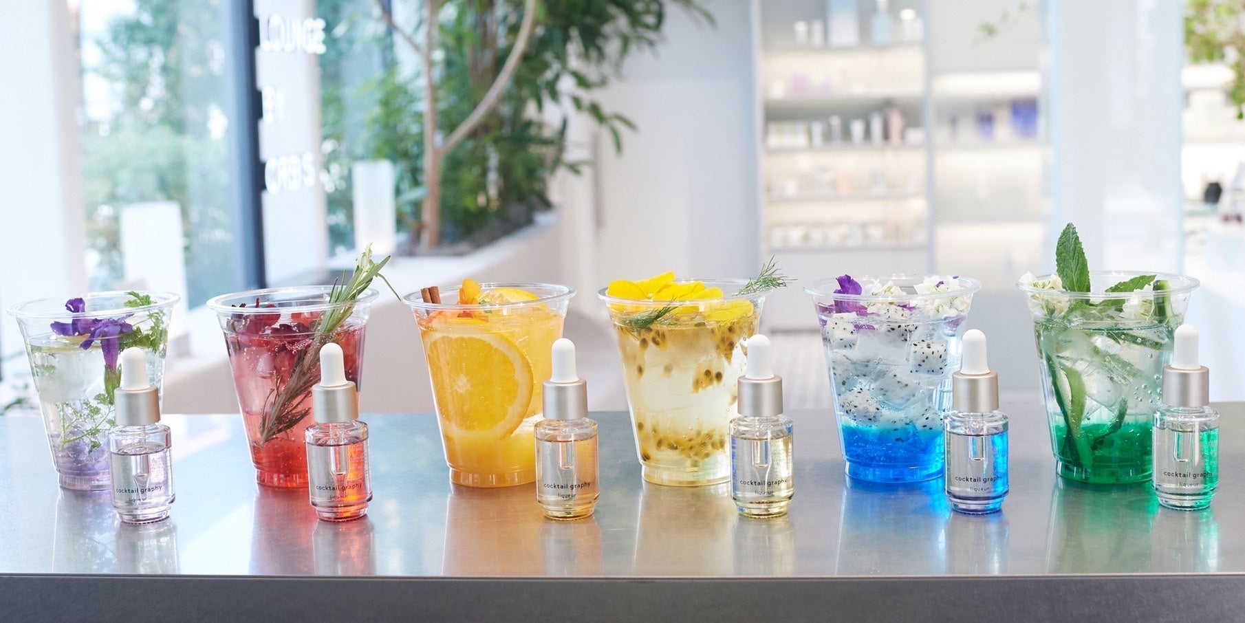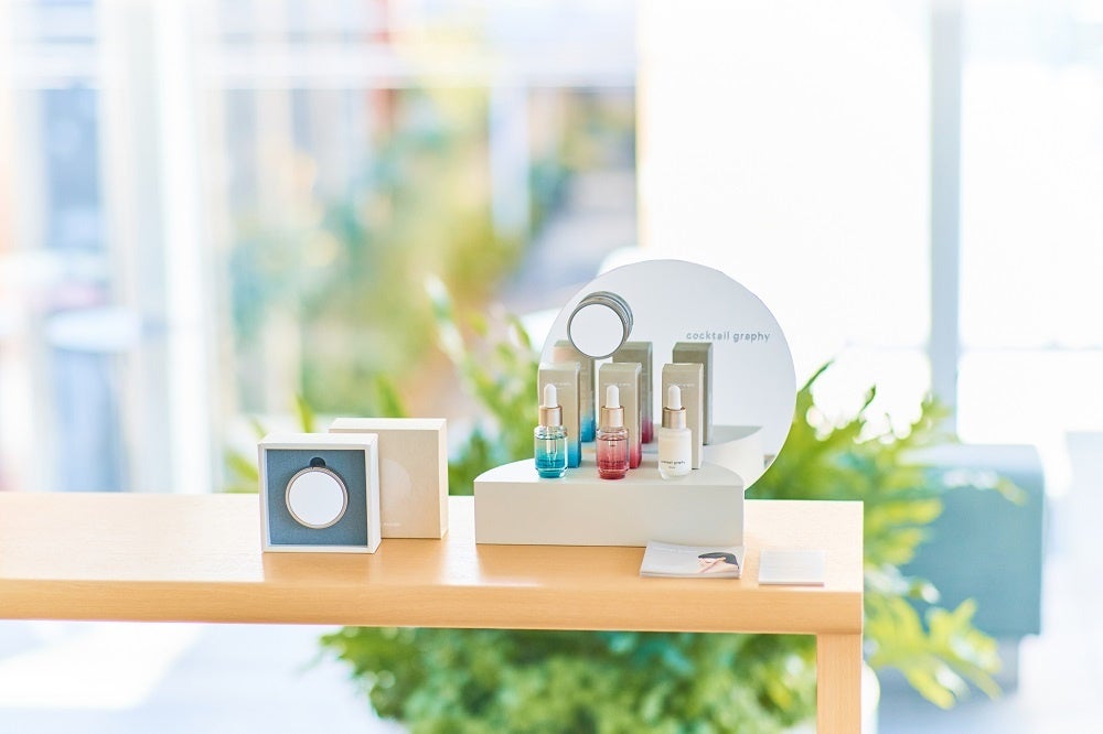 肌測定IoTデバイス『skin mirror(スキンミラー)』を用いて自分の肌状態を正しく知り、数百通りの組み合わせから、今の肌に合った3本のパーソナライズスキンケアが選定される『cocktail graphy』のサービスをご体験いただけます。また、来場者特典として、肌測定の診断結果と連動した “あなただけの”ノンアルコールカクテルをご提供いたします。パーソナライズスキンケアの個性を象徴するテーマカラーを視覚的にも楽しめます。