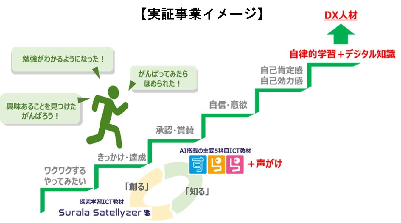 DX人材の育成には、ベースとなるスキル・経験・マインドが必要です。本実証では、当社のAIを搭載した主要5科目のICT教材「すらら」を利用して基礎学力の定着を、また「すらら」と探究学習専用ICT教材「すららSatellyzer」との組み合わせで、探究学習で学んだことをより深掘りしていく学習を自ら行えるようにすることで「知る」との連動を図ることができるかの2つの運用を実施します。