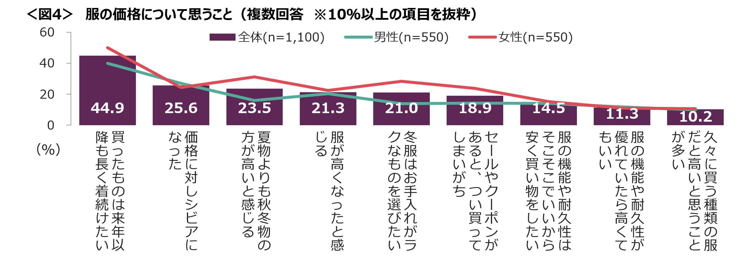 服の価格に関して、「買ったものは来年以降も長く着続けたい」が最も高く、「価格に対しシビアになった」、「夏物よりも秋冬物の方が高いと感じる」が続く。<図4>