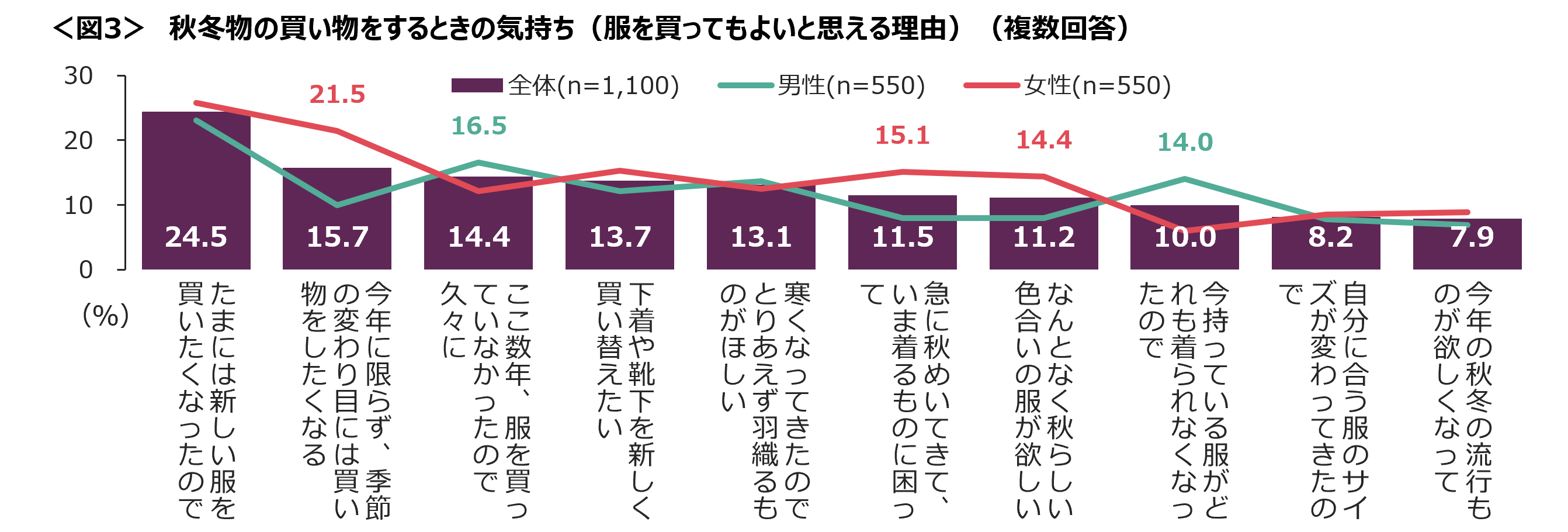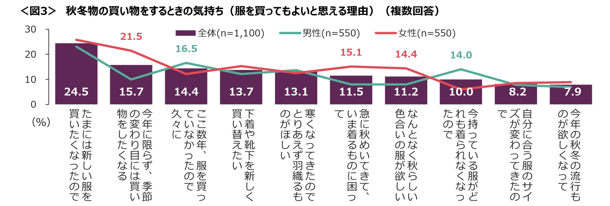 服を買う理由として、女性は「季節の変わり目には買い物をしたくなる」、男性は「今持っている服がどれも着られなくなったので」と回答した割合が高い。<図3>