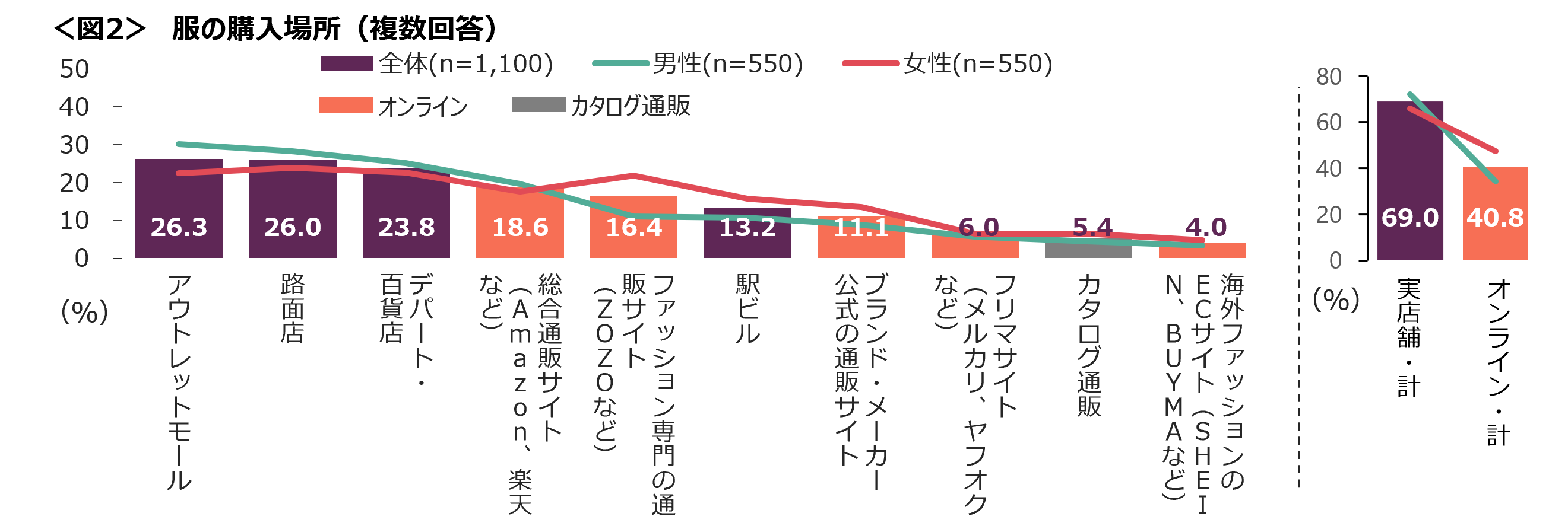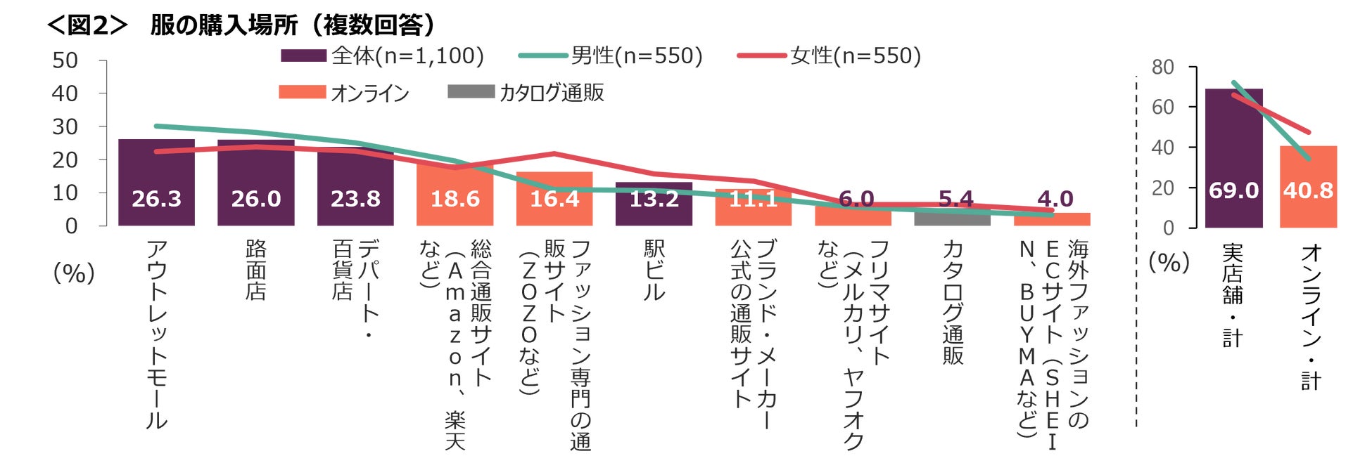 服の購入場所としては「アウトレットモール」「路面店」「デパート・百貨店」がTOP3。実店舗で購入している人は約7割みられ、オンライン通販で服を購入している人は約4割となった。<図2>。