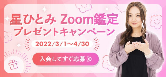 大好評キャンペーンの募集を新たに開始しました!「突然ですが占ってもいいですか?」(フジテレビ系)でのリモート鑑定さながらに、オンライン会議ツールZoomを介して星ひとみさんに直接占ってもらえる「Zoom鑑定プレゼントキャンペーン」を今春も開催いたします。大変貴重な機会です、ふるってご応募ください。