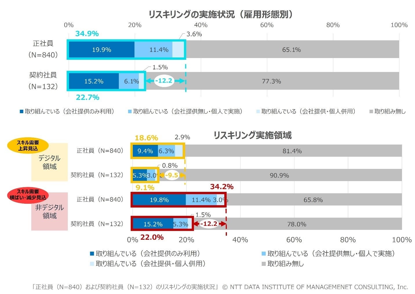 3.リスキリング実施率に属性差─正社員34.9%、契約社員22.7% 非デジタル領域に偏重
