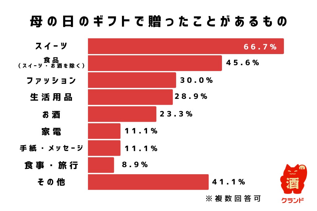 これまで母の日のギフトで贈ったことがあるものを聞いたところ、最も多かったのが「スイーツ」で66.7%でした。次に多かったのが「食品(スイーツ・お酒を除く)」で45.6%という結果になり、グルメ系のギフトが母の日のギフトとして人気であることがわかりました。また「お酒」と回答した方は23.3%と、贈る相手の趣向を選ぶギフトでありながら2割以上の方が選んだことがあると回答しました。