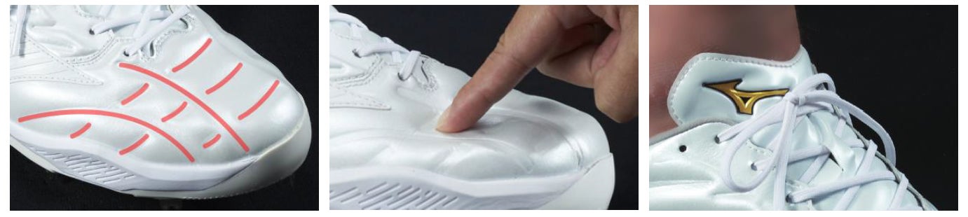 (左から)屈曲溝、アッパーの柔らかさ(イメージ)、V字タング
