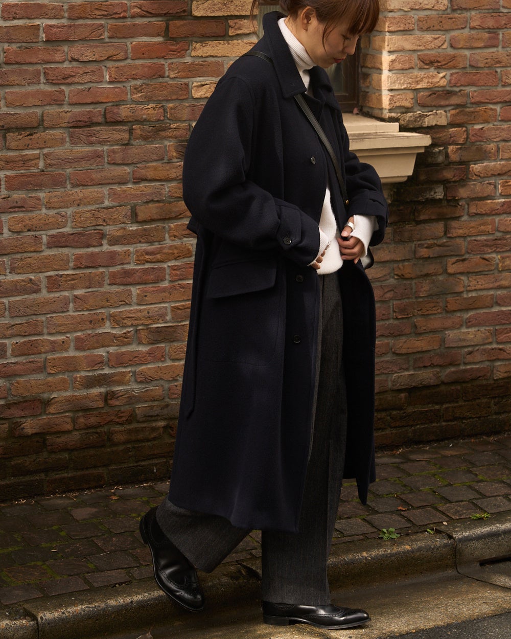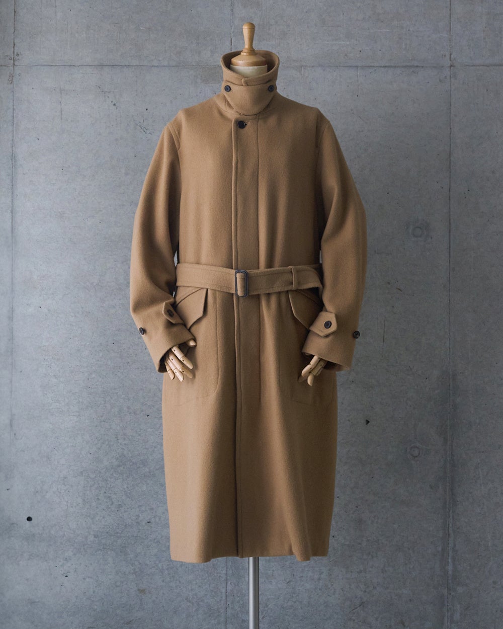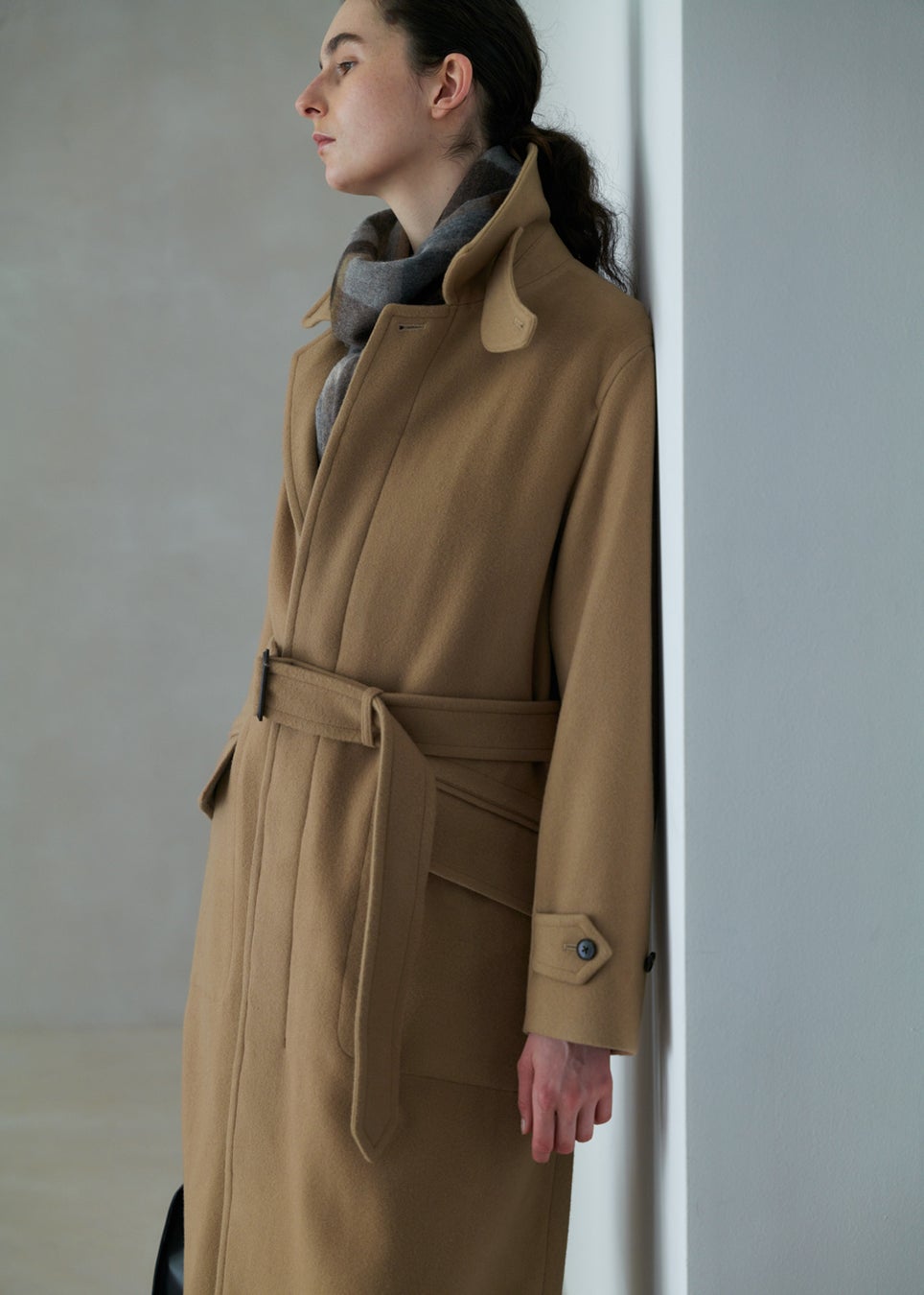 冷たい風が吹く日には襟元を立ててマニッシュに、冬の柔らかな日差しが心地よい日には軽やかに。一見なにげない仕様ですが、きちんとデザインされたチンストラップやウエストベルトで着方やシルエットの変化を楽しめるのも、このコートが「飽きずに」使える大きな理由です。