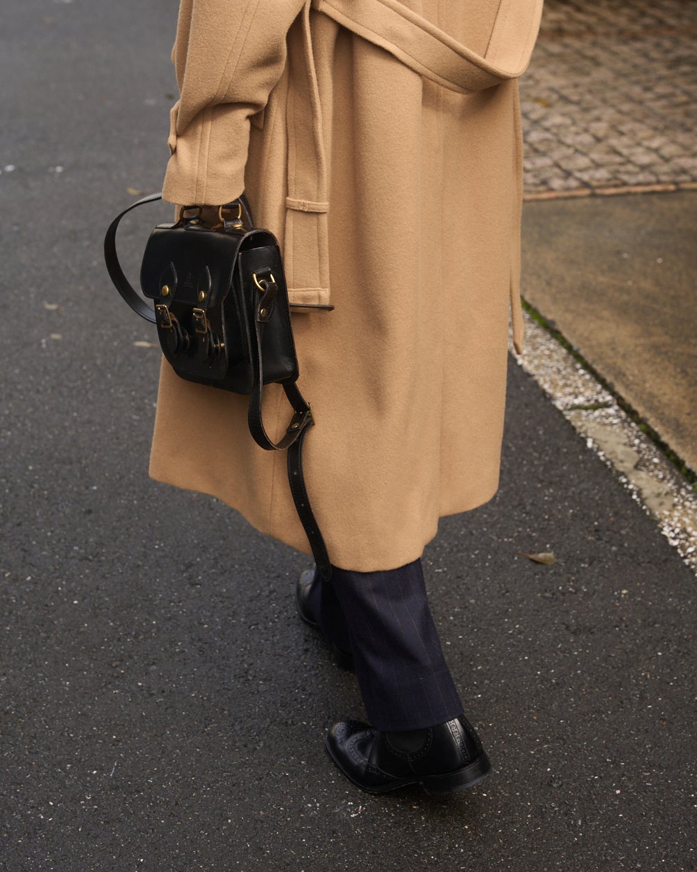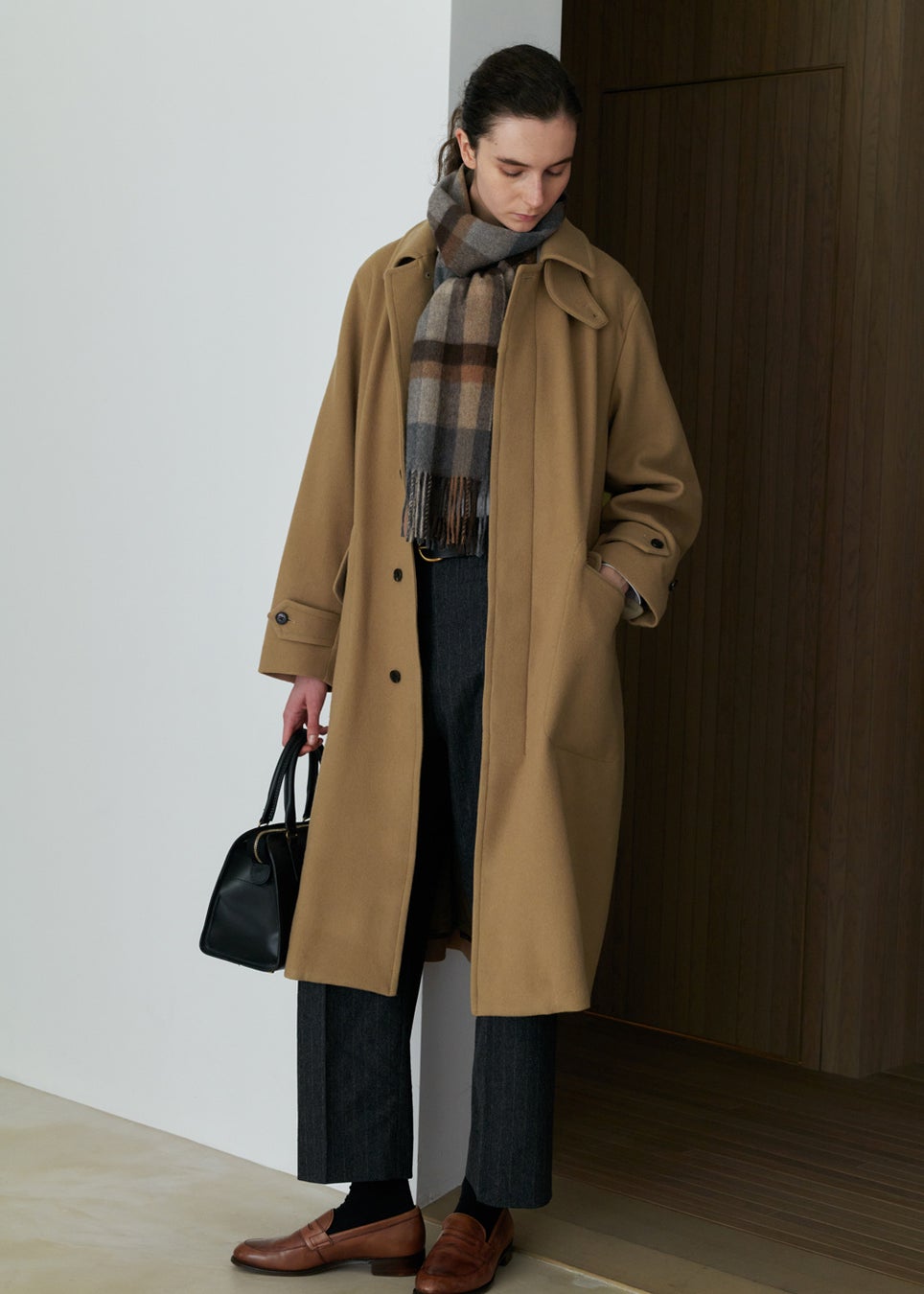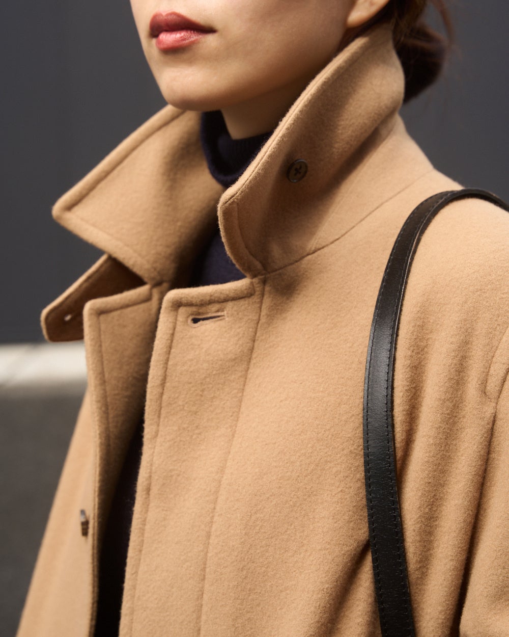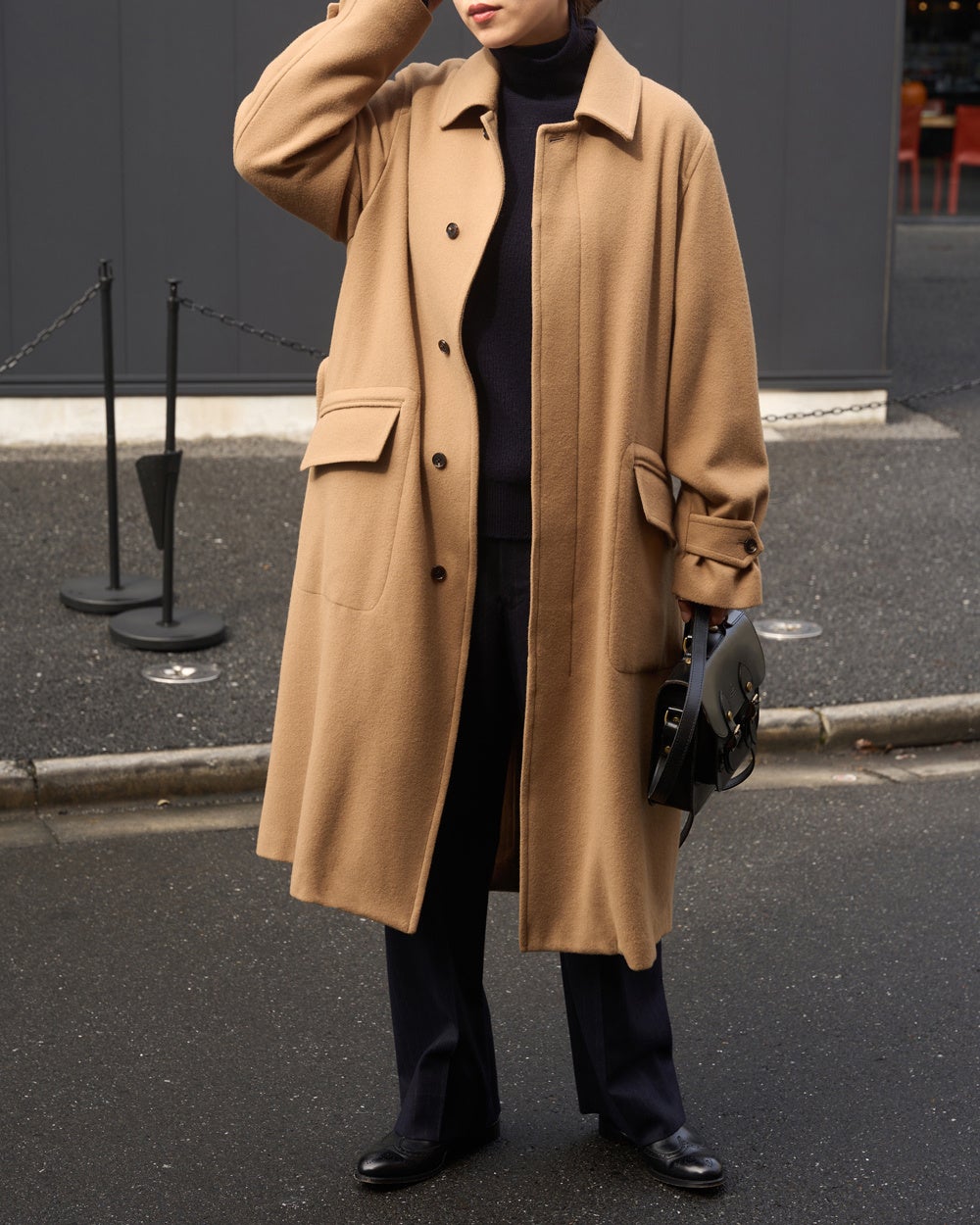 冷たい風が吹く日には襟元を立ててマニッシュに、冬の柔らかな日差しが心地よい日には軽やかに。一見なにげない仕様ですが、きちんとデザインされたチンストラップやウエストベルトで着方やシルエットの変化を楽しめるのも、このコートが「飽きずに」使える大きな理由です。