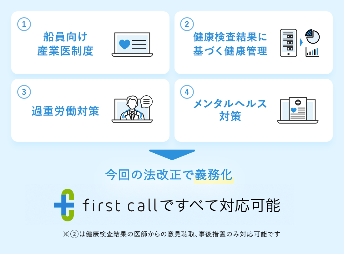 「船員向け産業医プラン」では、これまで「first call」で提供を行ってきた産業医の選定やオンライン産業医面談・ストレスチェックはもちろんのこと、義務化された船内巡視をオンラインでも対応するなど業界の特性に合わせたプランとなっています。