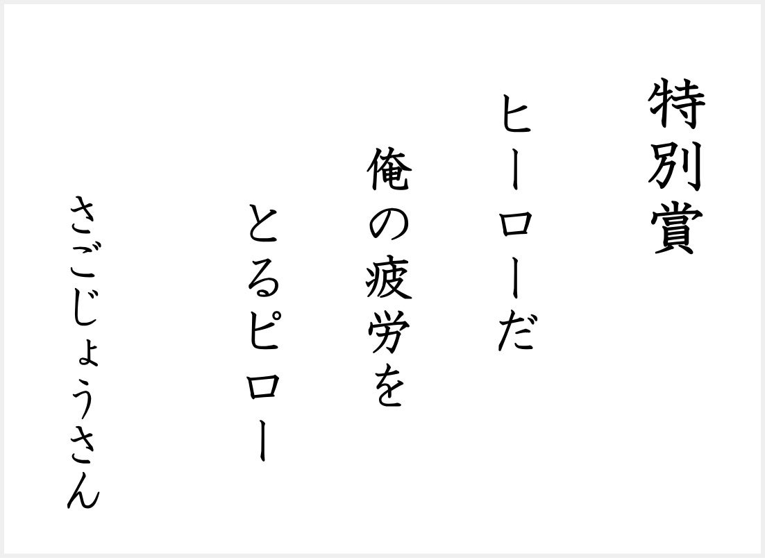 審査員コメント:言葉の響きが似ている「ヒーロー」「ヒロウ」「ピロー」をすべてまとめて川柳に起こしたダジャレ的な作品に仕上がっています。ご自身にとって、ピローが自分の疲労を取り除くヒーロー的な存在であることも伝わりました。