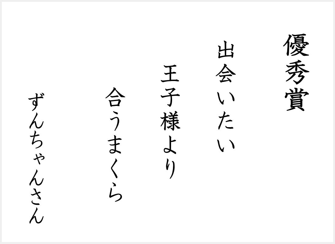 審査員コメント:一生をともにするのは「王子様」も「まくら」も一緒。王子様により、自分に合うまくらと出会いたいという切実な願いが伝わる作品でした。