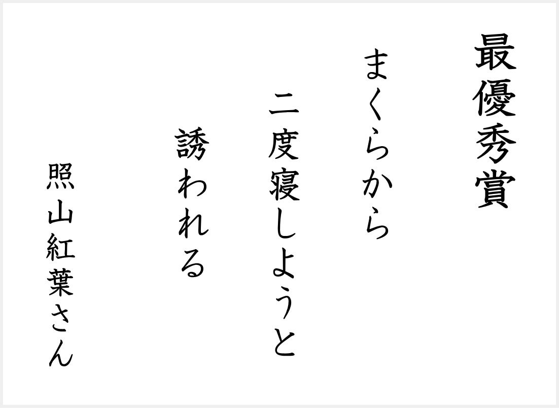 最優秀賞は「まくらから 二度寝しようと 誘われる」に決定。二度寝という怠惰を、気持ちよすぎる枕に誘惑されているという責任転嫁のさまがユニークで、かつ「まくら」とのパートナー的な関係性も伝わる作品。