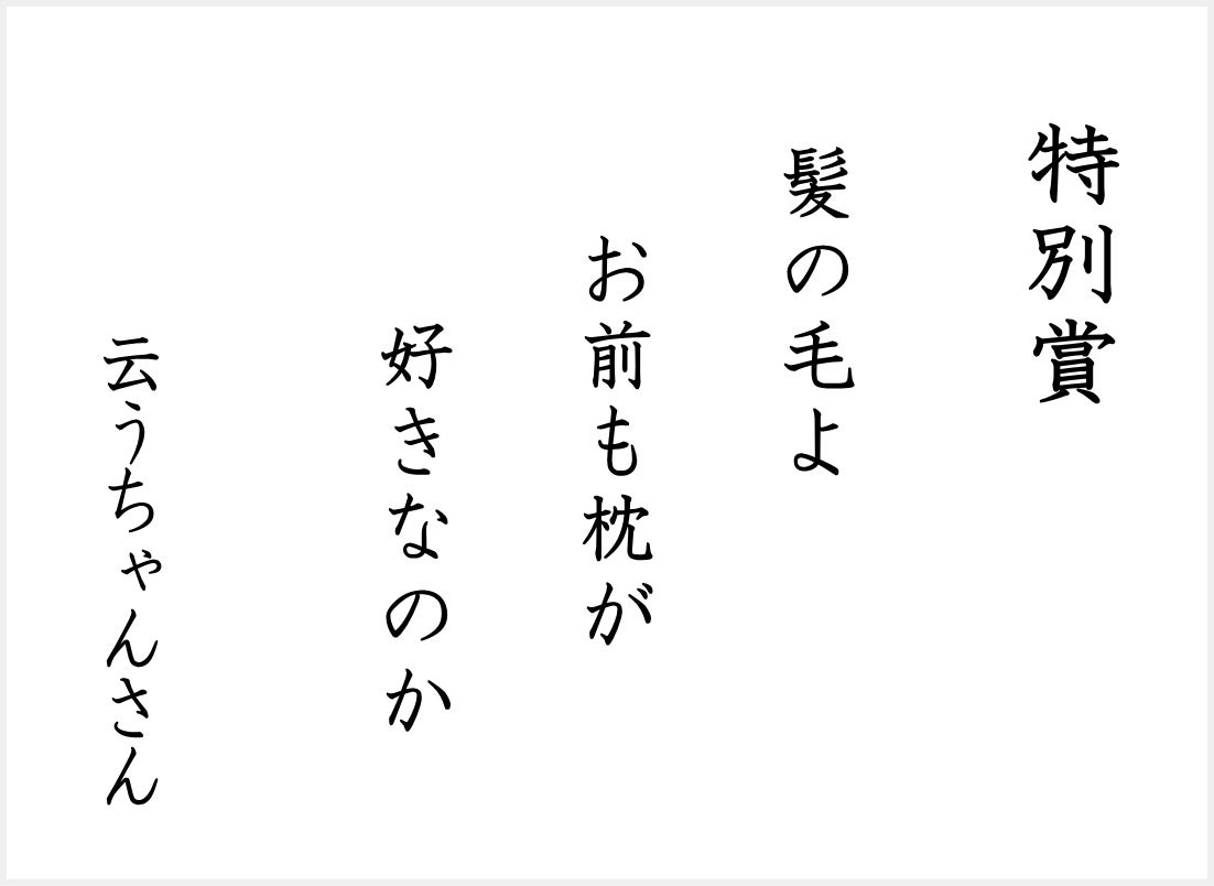審査員コメント:「川」の字で寝付いてたら、寝相が悪く、気がついたら枕が外れ「州」の字になっていたという絶妙な表現をされている作品でした。「州」の字の点々が「まくら」を表しています。