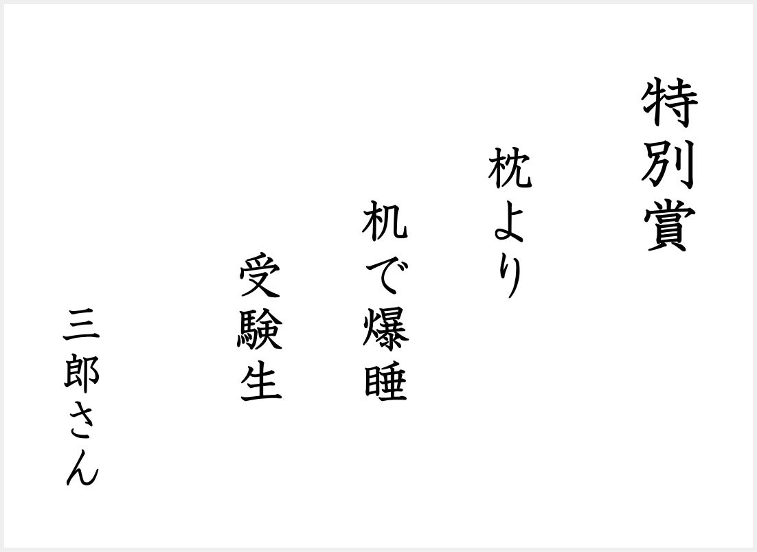 審査員コメント:受験生にとって、枕よりも机が身近な寝床。枕を高くして寝ることができることをお祈りしています。