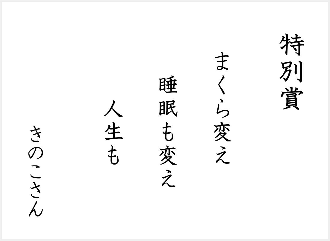 審査員コメント:まくらが変われば睡眠が変わる。睡眠が変われば人生も変わる。つまりまくら次第で人生が変わっていくということを表現した作品となっています。シンプルな川柳ではありますが、まくらの価値と大切さを伝えてくれる作品です。