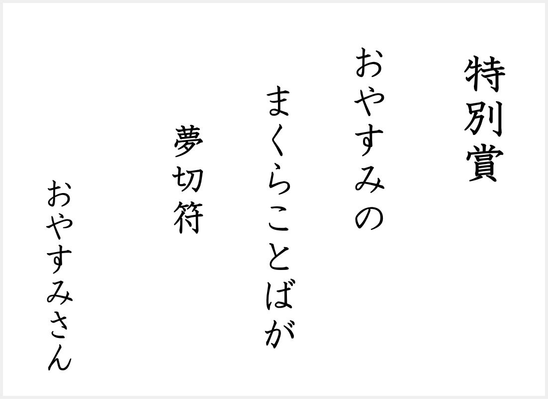 審査員コメント:枕詞とは、和歌などで用いられる手法で、習慣的に一定の言葉の前におく、五音節または四音節の一定の修飾語として使われています。毎晩、眠る前の「おやすみ」の挨拶が、夢の世界に旅立つことができる切符であるということを表現した作品に仕上がっています。