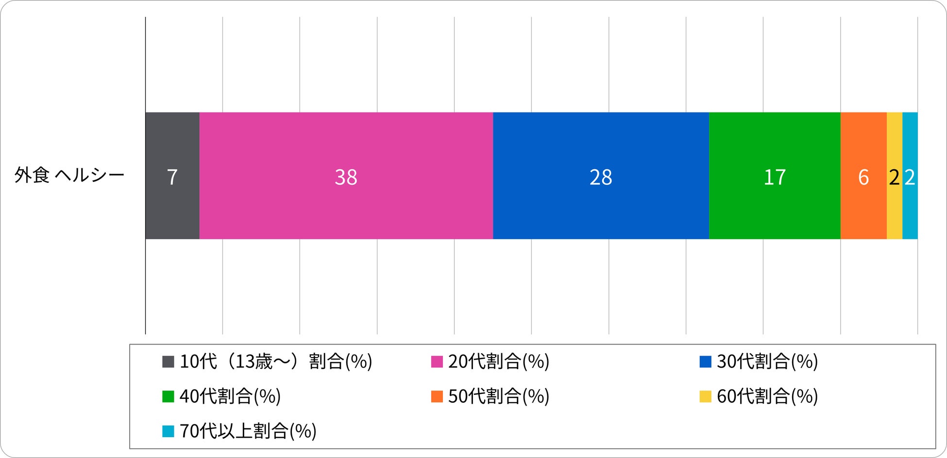 今度は「外食 ヘルシー」で検索した人の年代別割合を見ると、特に20代~30代の割合が多いことがわかります。