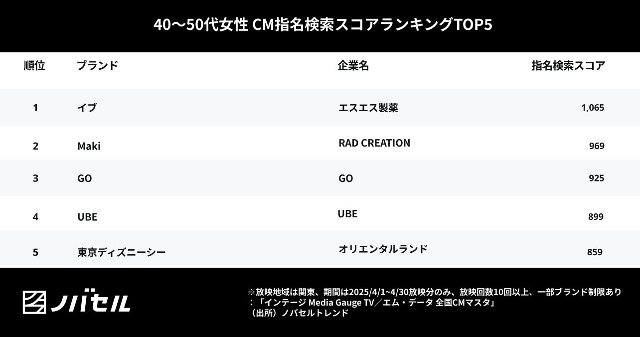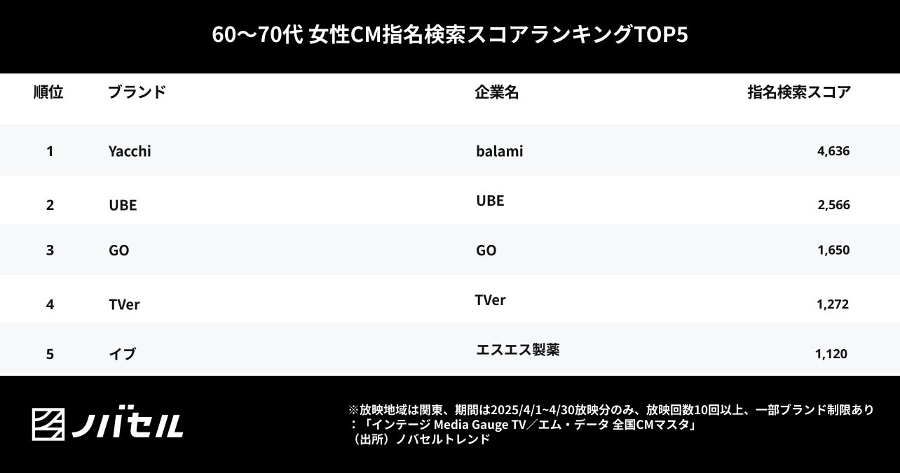 あらゆるテレビCMの指名検索スコアが可視化できる「ノバセルトレンド」を用いて、2025年4月の指名検索スコア順テレビCMランキングの上位5位を、年代・性別ごとにご紹介します。