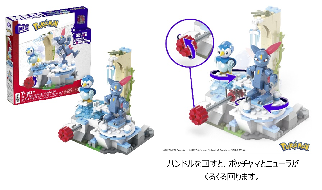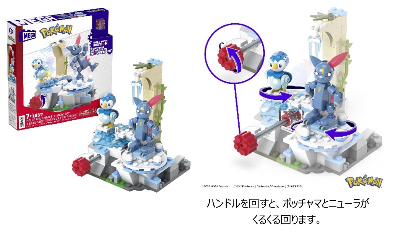 ポッチャマとニューラが雪あそびしている冬の世界を再現できるブロックセットです。歯車ブロックに連結したハンドルを回すと、ポッチャマとニューラがくるくる回ります。組み立てた後も楽しめるおどろきのギミックで、想像力をさらにかき立てます。他のメガ ポケモン アドベンチャーワールド 歯車ブロック付きシリーズと組み合わせて遊ぶことも可能です。