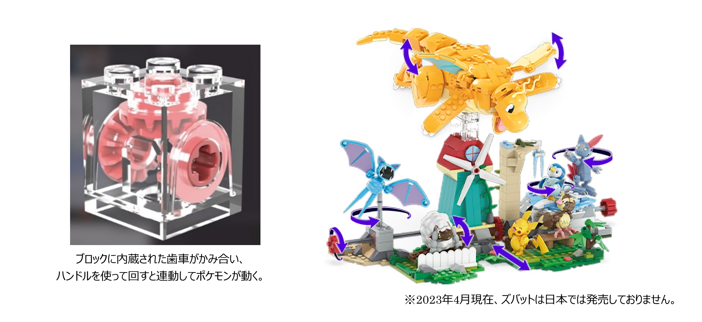 歯車シリーズの特徴であるギアブロックパーツは歯車が内蔵されており、ハンドルを使ってギアを回すことでギア同士が連動してポケモンが動く仕組みとなっております。また、すべての組み合わせるとすべて連動して同時に動くため、遊びの幅が広がります。