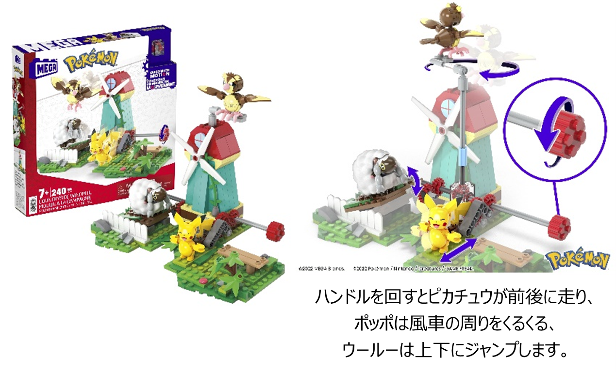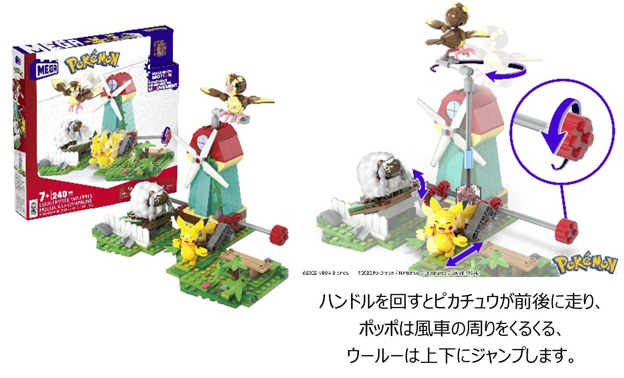 ピカチュウ、ポッポ、ウールーが風車と緑豊かな丘でおいかけっこをしている風景を再現できるブロックセットです。歯車ブロックに連結したハンドルを回すと、ピカチュウが前後に走り、ポッポは風車の周りをくるくる走り、ウールーは上下にジャンプします。他のメガ ポケモン アドベンチャーワールド 歯車ブロック付きシリーズと組み合わせるとギミックが連動して、よりダイナミックな動きを楽しめます。