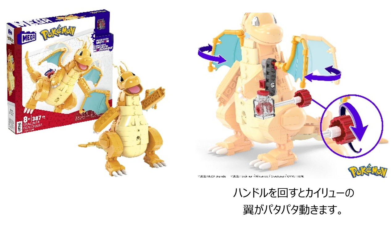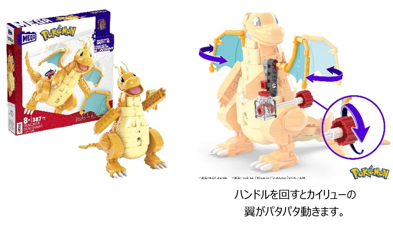 【Point】 ✓ブロックを組み立ててリアルに再現できる「メガ ポケモン」から、 歯車ブロックが付いた「メガ ポケモン アドベンチャーワールド」の新シリーズが登場! ✓歯車ブロックに連結したハンドルを回すとポケモンたちがくるくる回ったり、ジャンプしたりと、 組み立てた後も楽しめて、想像力をさらにかき立てる! ✓メガ ポケモン アドベンチャーワールド 新シリーズは組み合わせが可能! 組み合わせるとすべて連動して同時に動くので遊びの幅が広がる! ✓387ピースのブロックで組み立てるカイリューは翼が動くだけでなく、 首・手・足・尻尾も可動式なので、好きなポーズを取って遊べる! |