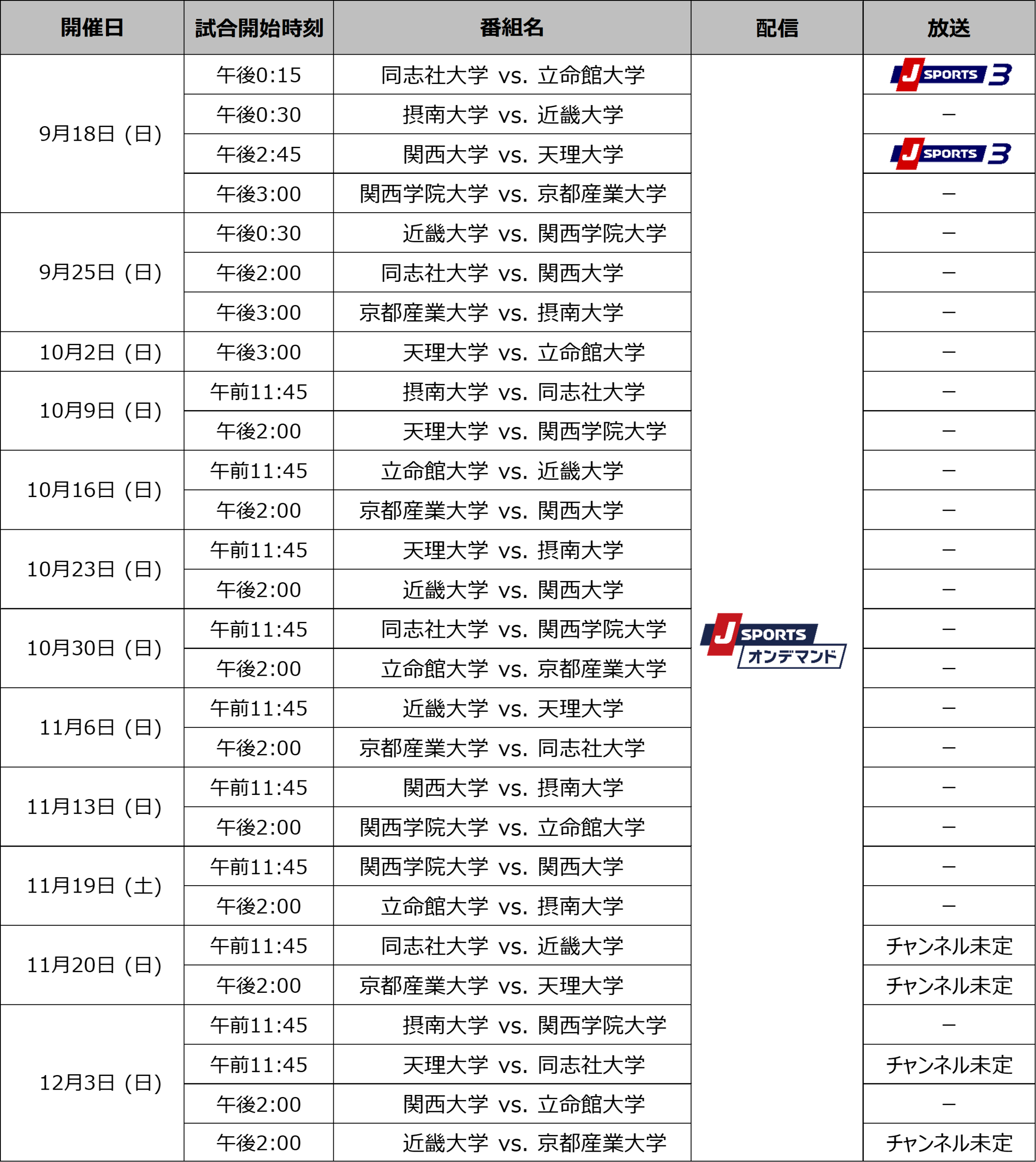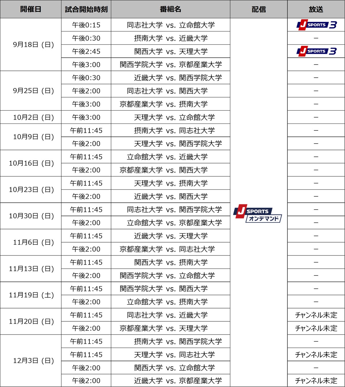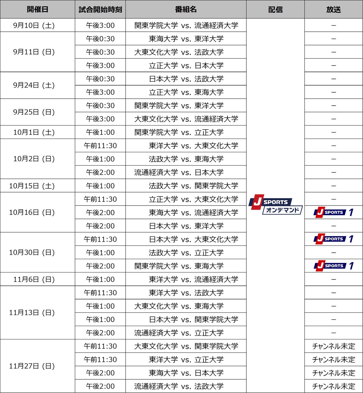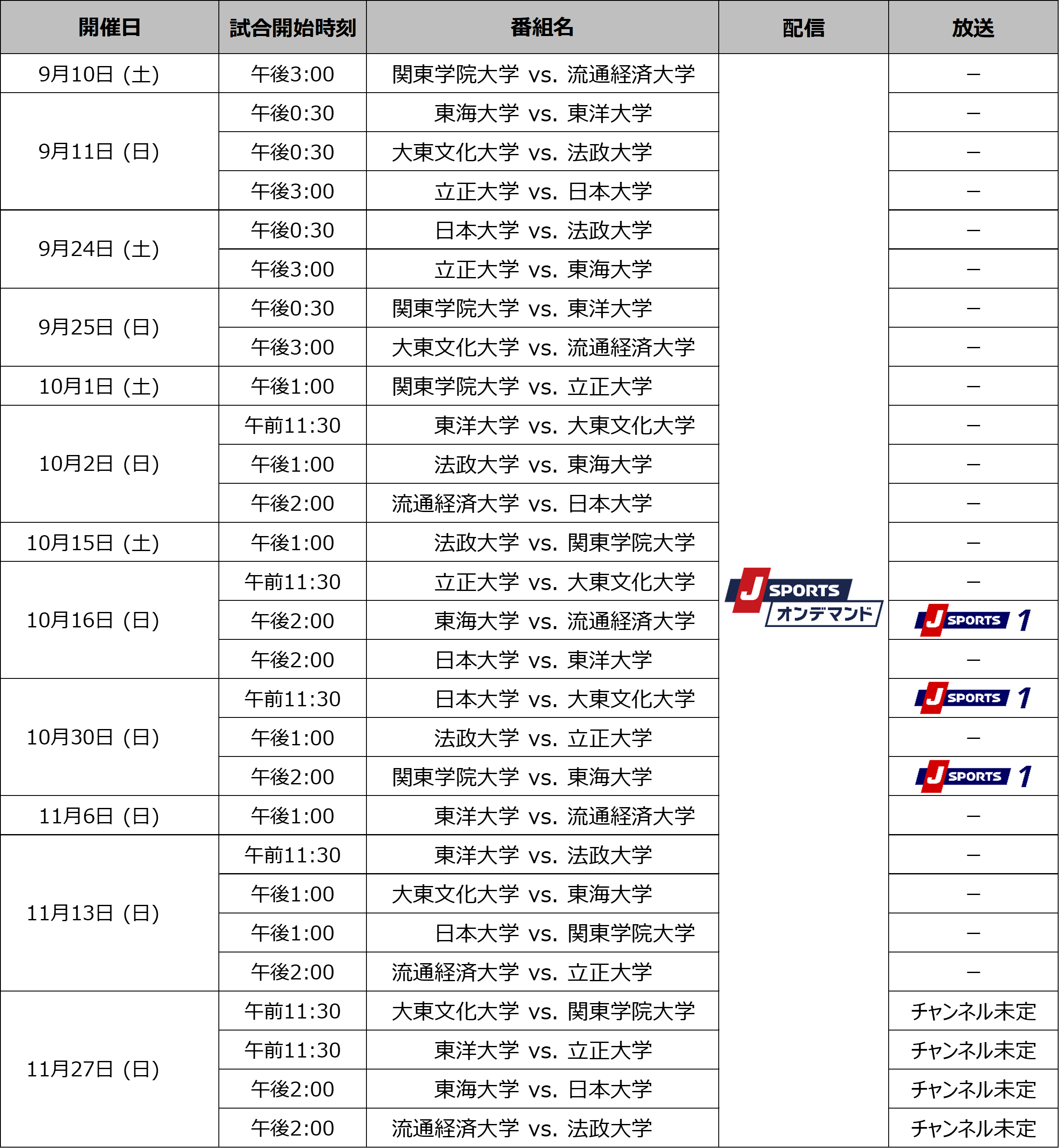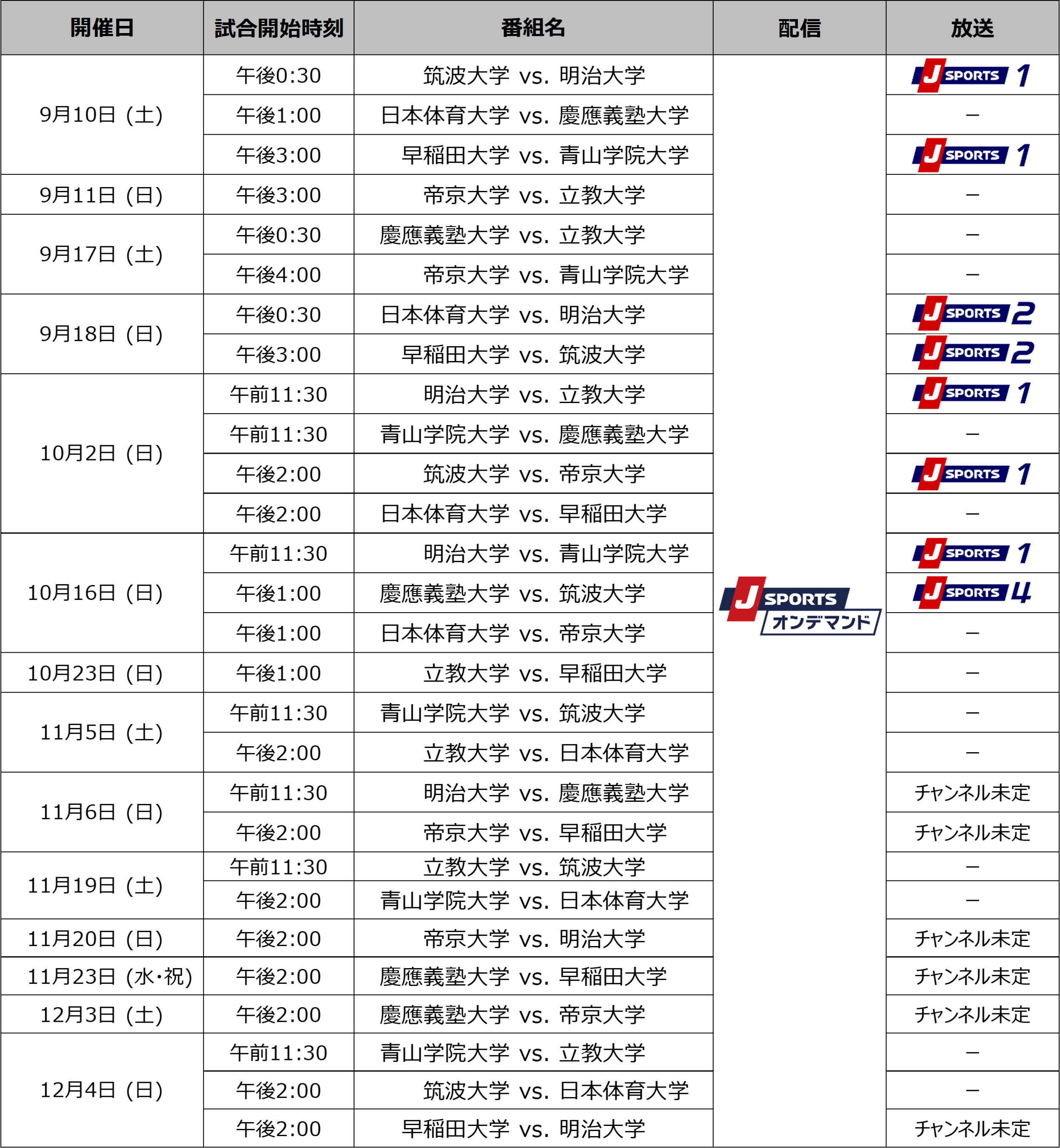 国内最大4チャンネルのスポーツテレビ局、株式会社ジェイ・スポーツ(本社 東京都江東区、代表取締役社長 長谷 一郎、以下「J SPORTS」 ※1)は、9月10日(土)に開幕する「関東大学対抗戦 Aグループ(以下、関東対抗戦)」、「関東大学リーグ戦 1部(以下、関東リーグ戦)」と、9月18日(日)に開幕する「関西大学リーグ Aリーグ(以下、関西リーグ)」を、PC、スマホ、タブレットで見られる動画配信サービス「J SPORTSオンデマンド」 ※2 で今年も全試合を配信いたします。また、注目試合は実況・解説付きで徹底放送いたします。