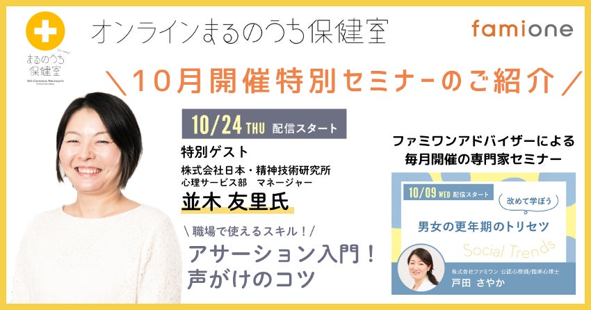 10月のオンラインセミナーには、株式会社日本・精神技術研究所 心理サービス部 マネージャー 並木 友里氏、株式会社ファミワン 公認心理師/臨床心理士 戸田 さやかが登壇します。並木氏のセミナーは、「アサーション入門!声がけのコツ」と題し、「あなたもOK、わたしもOK」というスタンスで、周囲の人と良好な人間関係を作っていく為のアサーションスキルを学びます。戸田のセミナーでは、経済損失3兆円とも言われる更年期症状について男女共に自分なりのトリセツを考えていく方法についてお話しいたします。