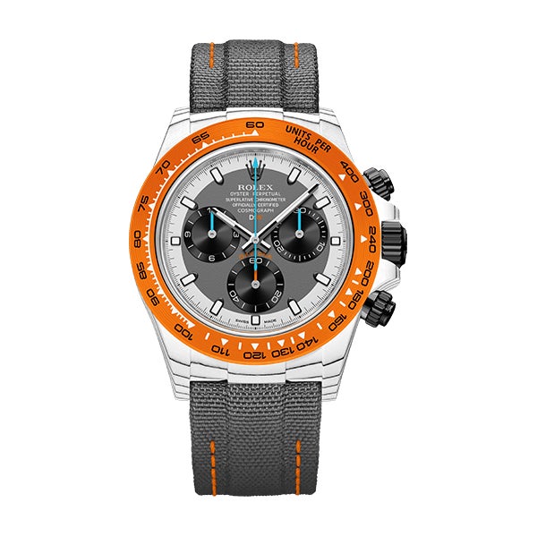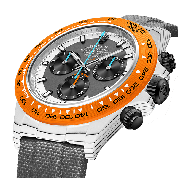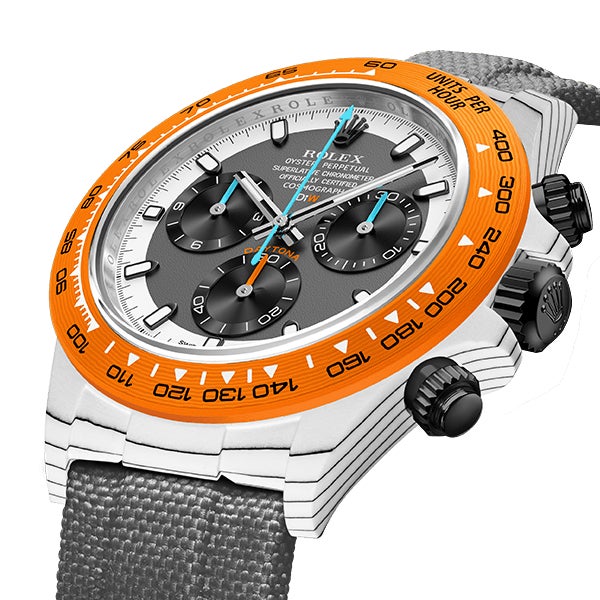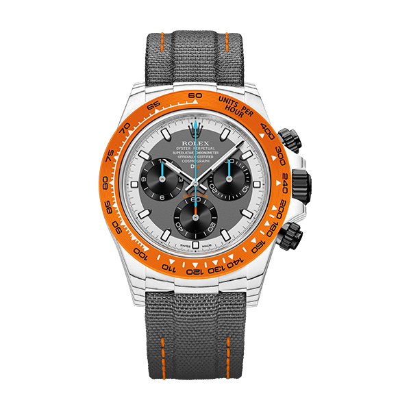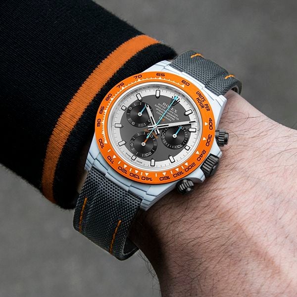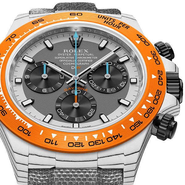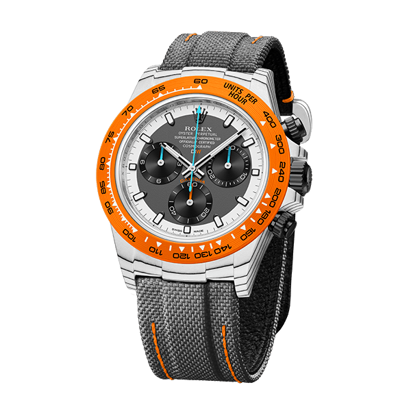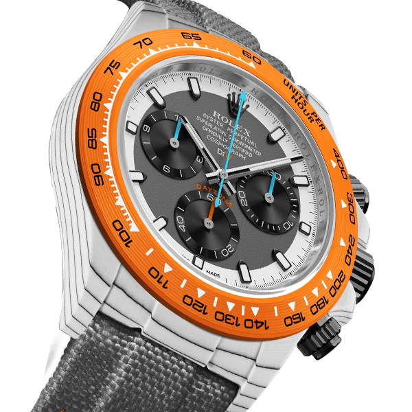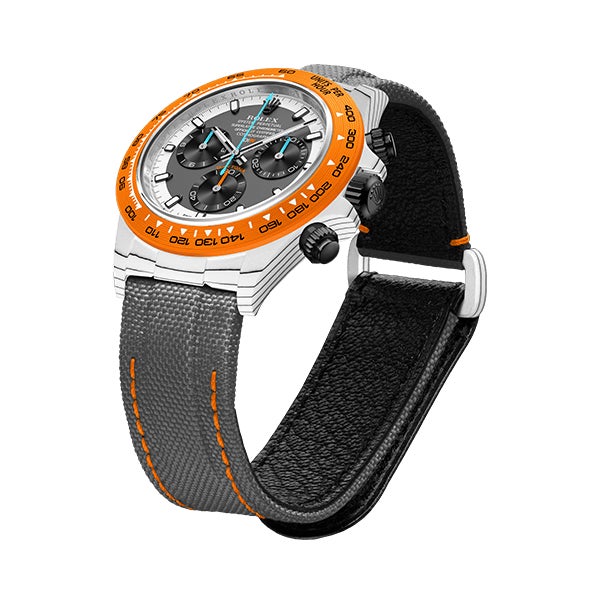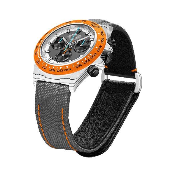 ROLEX DAYTONAをベースに、透過性、耐薬品性などさまざまな特性を持つ高付加価値繊維であるクォーツファイバーを使用してカスタマイズ。オレンジとホワイトの独特なバランスを表現しています。