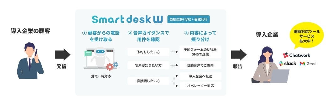オフィスや店舗の受電を自動応答(IVR)と受電代行で、顧客体験を損なわずスマートな応対を可能にするサービスです。オフィスにかかってくる電話は、自動応答(IVR)を使用し仕訳をおこなうため、応対が必要な受電のみをオペレーターにつないだり、重要な内容のみ転送することができます。受付業務は365日24時間対応、時間外の受電内容も音声ログやレポート送信が可能です。初期費用0円・月額3,000円から導入できるプランをご用意しています。