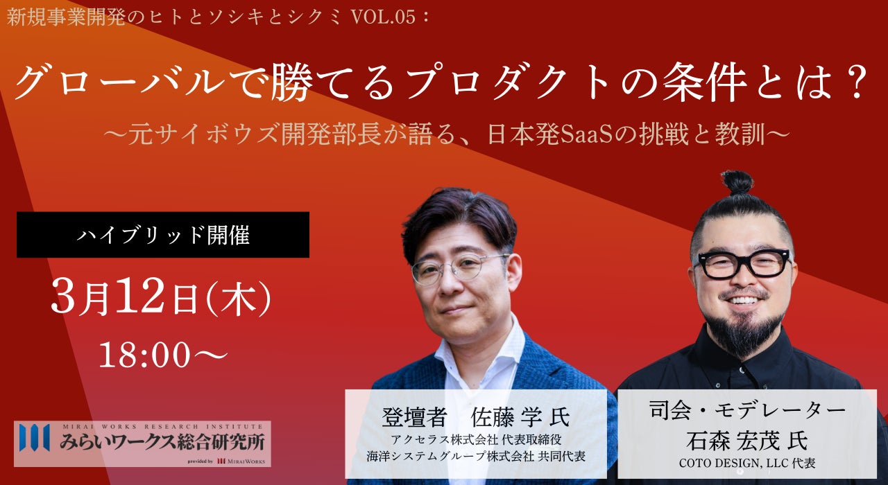 新規事業・リスキリング・サステナビリティ・外部人材活用に関する情報を発信するメディア『みらいワークス総合研究所』を運営する株式会社みらいワークス(本社:東京都港区、代表取締役社長 岡本 祥治)は、2026年3月12日(木)に、シリーズセミナーの第5弾「新規事業開発のヒトとソシキとシクミ vol.05:グローバルで勝てるプロダクトの条件とは?」をハイブリットで開催します。