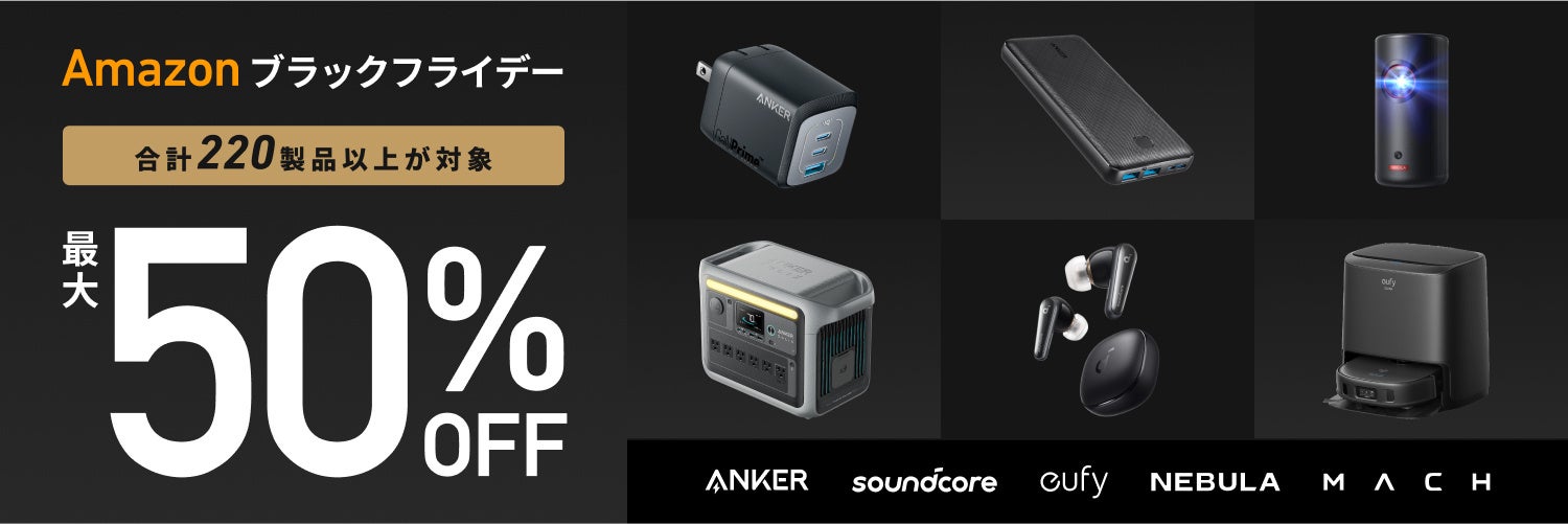 米国・日本・欧州を中心にデジタル関連製品でトップクラスの販売実績を誇るAnkerグループの日本法人、アンカー・ジャパン株式会社(本社:東京都千代田区、代表取締役CEO:猿渡 歩)は2023年11月24日(金)0:00から12月1日(金)23:59まで、Amazonが開催する恒例のビッグセール「Amazonブラックフライデー」において、最新のポータブル電源や人気の完全ワイヤレスイヤホンを含むチャージング関連製品やオーディオ製品、家電製品等の220製品以上を、最大50%OFFにて販売致します。またAmazon ブラックフライデーに先駆けて2023年11月22日(水)0:00〜11月23日(木)23:59の2日間で開催される「先行セール」でも、AnkerグループのAmazon ブラックフライデー対象製品を先行してセール価格(※1)でご購入いただけます。