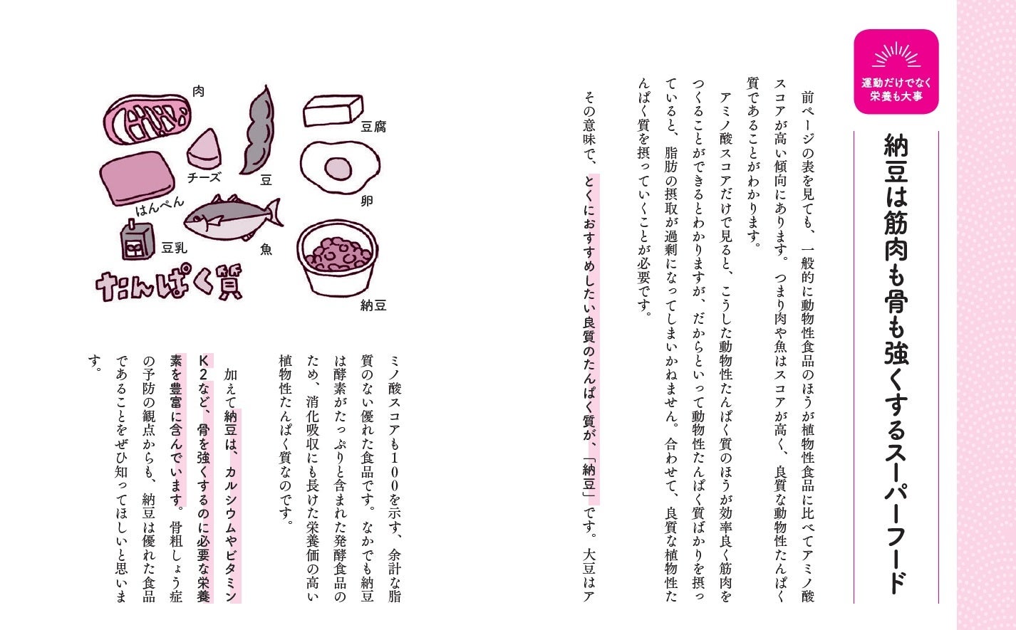 こちらの章では、良質なたんぱく質が摂取できる納豆や、体内のカルシウム吸収を促して骨を増強するとともに、筋肉の合成を促す作用があるビタミンDなど、筋肉を強くするための栄養術を紹介しています。