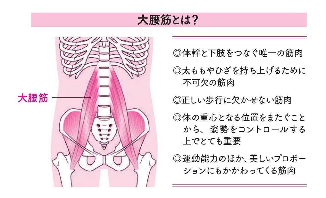 大腰筋には、①太ももやひざを持ち上げる、②骨盤を起こして正しい姿勢を保つ、という大切な2つの働きがあります。