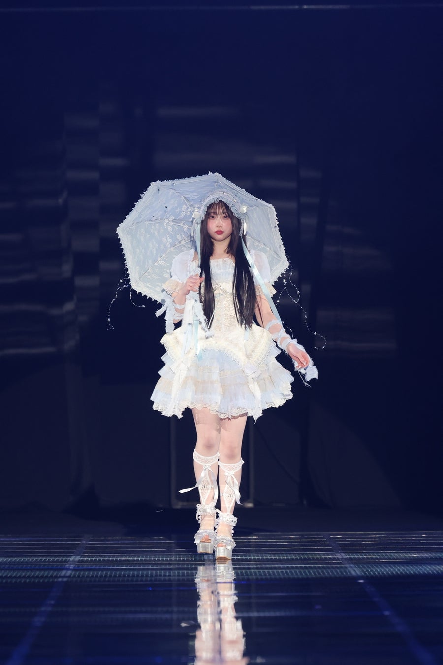 ランウェイのラストはLARMEのレギュラーモデルとしても活躍している松本かれん(FRUITS ZIPPER)が登場し、まるで天使のようなビジュアルで観客を惹きつけました。
