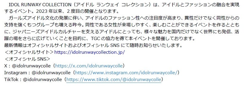 東京ガールズコレクション(以下、TGC)協⼒のもと、2023年に“新時代ガールズイベント”として注目を集めたIDOL RUNWAY COLLECTION(アイドル ランウェイ コレクション)が規模を拡大し、2025年3⽉2⽇(⽇)に『CREATEs presents IDOL RUNWAY COLLECTION 2025 Supported by TGC』(以下、IRC2025)として国立代々木競技場 第一体育館にて開催いたしました。
