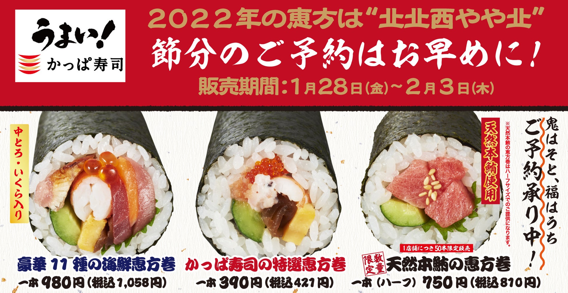 コロワイドグループのかっぱ寿司(カッパ・クリエイト㈱ 本社:神奈川県横浜市)は、2022年1月28日(金)~2月3日(木)の期間、かっぱ寿司全店にて『かっぱ寿司の特選恵方巻』『豪華11種の海鮮恵方巻』『天然本鮪の恵方巻』の3種類の恵方巻を販売いたします。