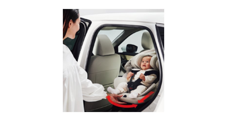 360°クルッと回転するので、シートの正面から赤ちゃんの乗せ降ろしが可能。無理な体勢をとることなくスムーズな乗せ降ろしができます。