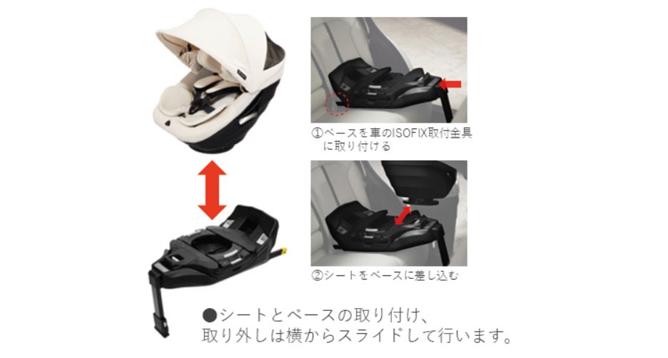 「セパレートISOFIX取付」は、シートとベースの分離を実現。ベースのみを取り付けてからシートを組み合わせることで、車内への持ち込みや他の車への付け替えも簡単に行え、取り付けの負担を軽減します。