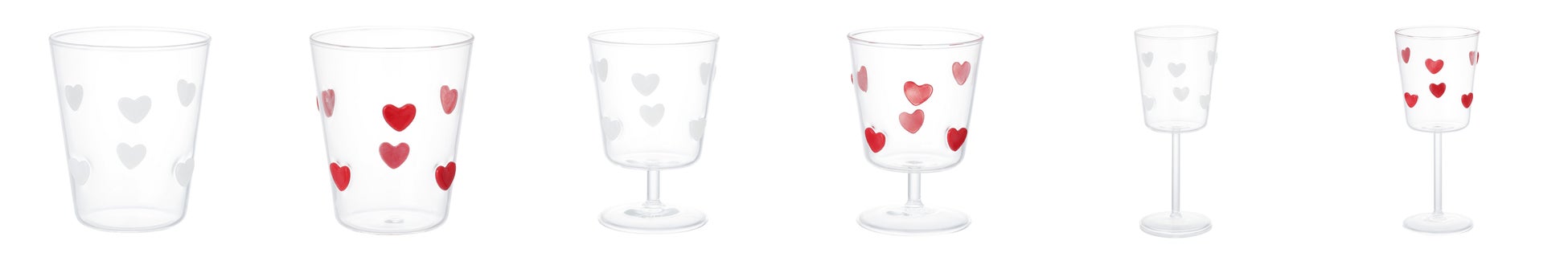 ハートがドットのようにちりばめられたデザインのグラスです。シンプルな形状のタンブラーから、ハートゴブレットやワイングラスまでラインアップ。組み合わせればより華やかな印象になり、バレンタインパーティーや特別なシーンにぴったりのグラスシリーズです。