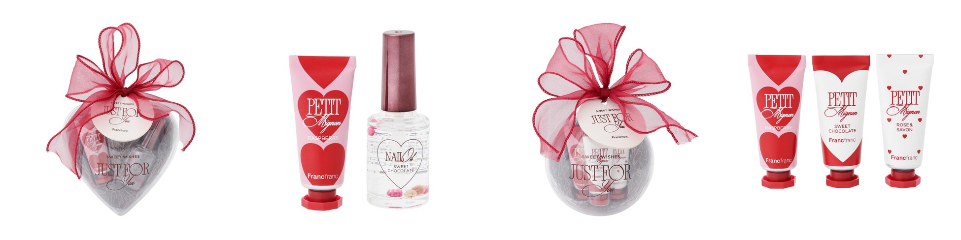 オーナメントのようなハート型クリア容器に入った、ネイルオイルとハンドクリームのハンドケアセットです。ネイルオイルはお花入りで、見た目も華やか。ハンドクリームはラズベリーの香りで、ネイルオイルはバレンタインらしいスウィートチョコレートの香りを楽しめます。