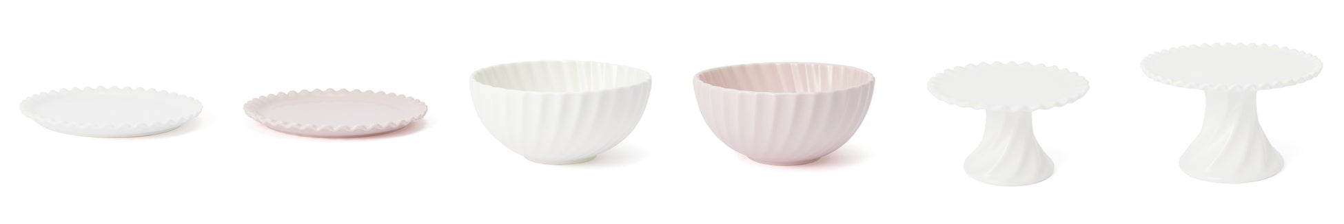 ホイップクリームのようなやわらかな質感をイメージしたプレートとボウルです。プレートは、ケーキや焼き菓子などを盛り付ければ、いつものティータイムが華やかになります。ボウルは、いちごやマシュマロなどの小さなお菓子やフルーツはもちろん、チョコレートソースを入れてディップ用として使うのもおすすめです。