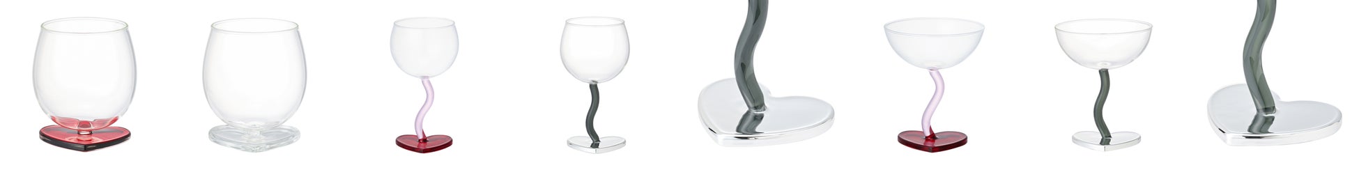 ハートモチーフのワイングラスとデザートグラスです。カラフルなハート型の台座と、うねうねとしたステムのデザインが特徴。トレンド感のある新色のシルバーが登場し、既存のレッドと組み合わせてテーブルコーディネートをお楽しみいただけます。ワイングラスにはカクテルやシャンパン、デザートグラスには甘いスイーツを入れて、ディナータイムや女子会でも活躍するアイテムです。