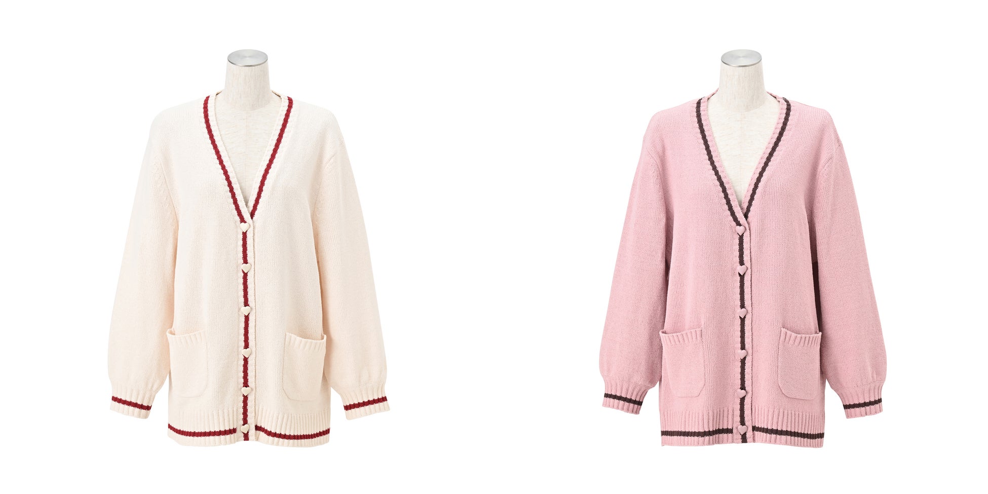 大きめのハート型ボタンがポイントのカーディガンです。柔らかなモールニット素材で、冬から春にかけての温度調節に最適。バレンタインを連想させるカラーリングで、「ヒアルロン酸加工 ハートラインサテンパジャマ」とのコーディネートを楽しめます。