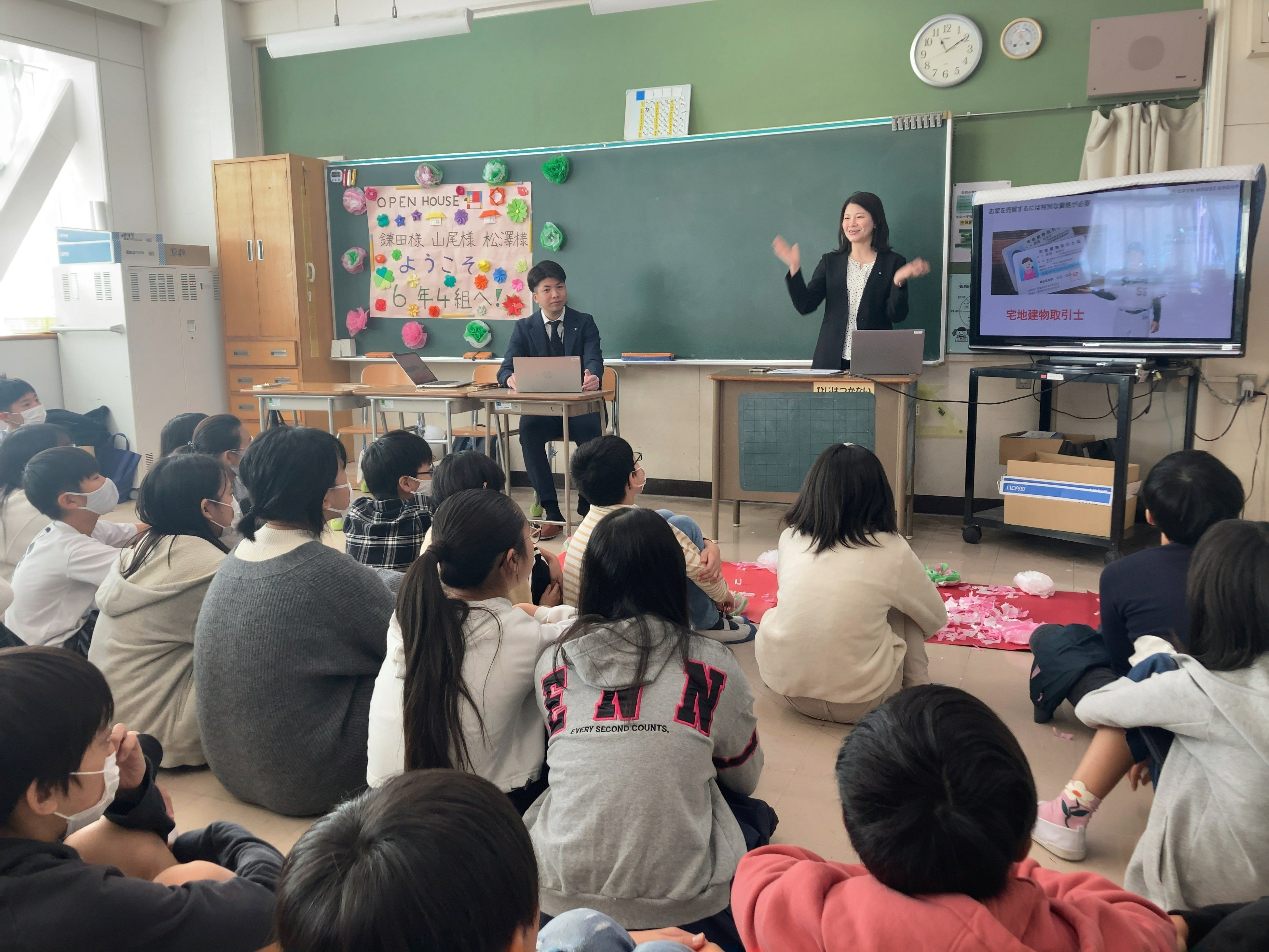 授業では、家を買う人はどのように考え、何を気にするのか、という児童のみなさんの興味に応え、「みなさんだったらどんな家が欲しいか」という問いかけを中心に、求めている条件はお客様毎に違い、それぞれに合った物件のご提案が大事だというメッセージを伝えました。授業時間では足らず、休憩中やお見送りの時間まで児童のみなさんからの質問は止まらず、訪れた当社社員は児童のみなさんの発想力に圧倒されました。