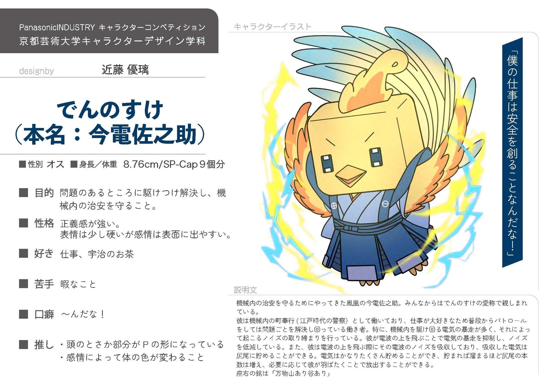 その後、ショールームリニューアルプロジェクトチームの社員により5つの候補に絞られ、パナソニック インダストリーの宇治拠点、国内外関連拠点からの社員の投票によって、近藤優璃さん(キャラクターデザインコース・3年)の「でんのすけ」が「SP-Cap」のキャラクターとして選ばれました。