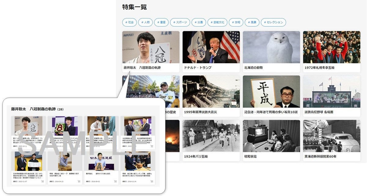 150年以上の歴史を誇るアーカイブの中から、厳選した報道写真を新設の「特集一覧」でご紹介。「人物」「災害」「皇室」など9つのジャンルを設け、新聞社ならではの臨場感あふれる写真や懐かしい昭和の生活風景、「周年」を迎えるトピックなど、さまざまなテーマに沿った素材をご覧いただけます。ジャンルでの絞り込みも可能で、ご要望に添った写真を素早く探せます。