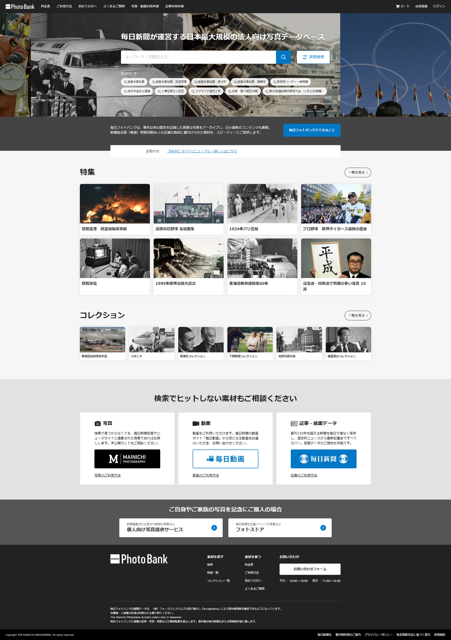 毎日フォトバンクの特徴やご利用方法をまとめた「初めての方へ」ページも新設。写真のほか、記事や動画の利用方法もご案内しています。
